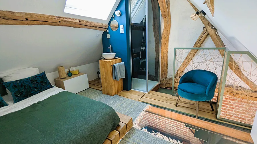 - Chambre suite sous les toits avec salle de bain ouverte.